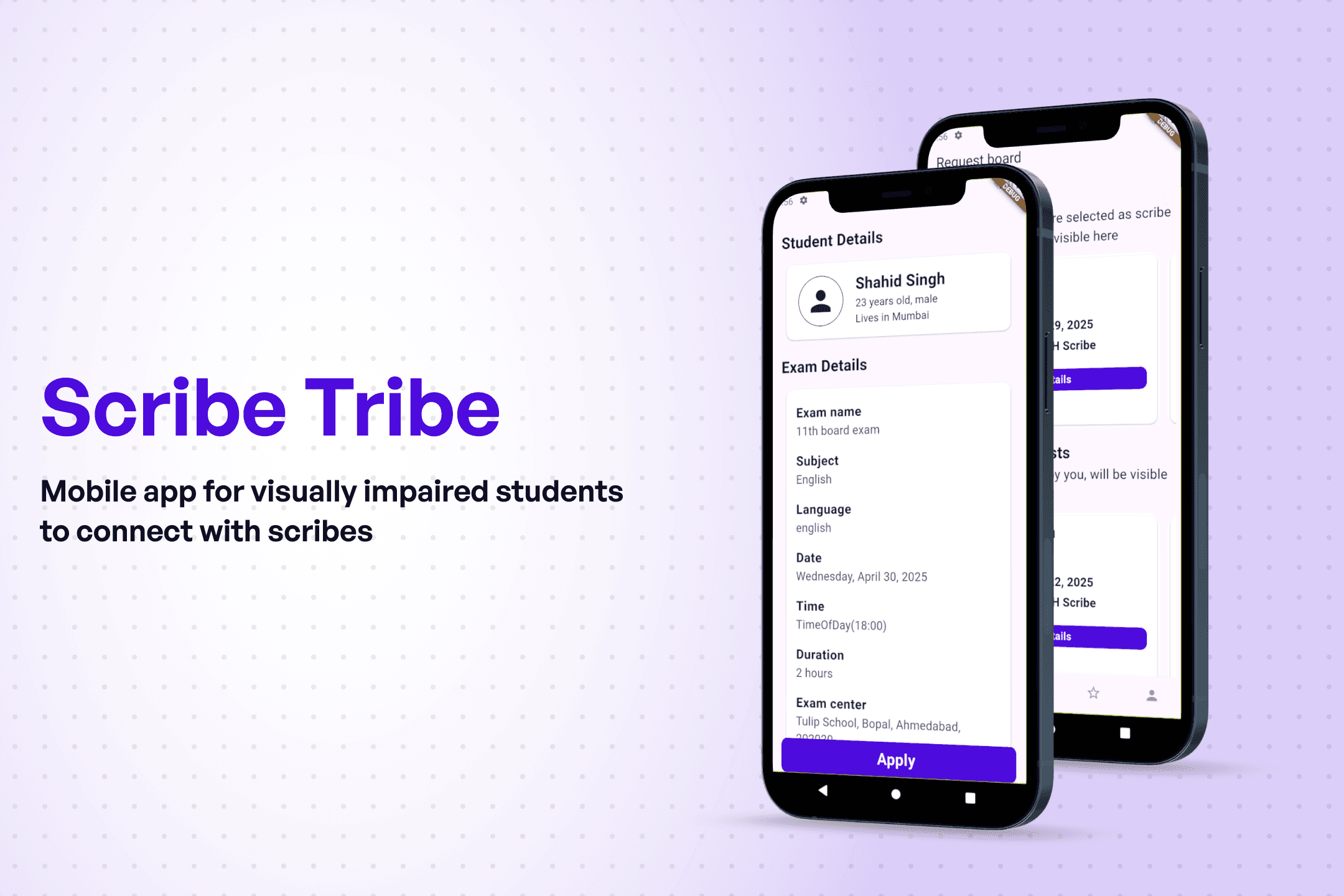 A visually impaired student has to go through a number of hurdles in order to find a scribe (volunteer who writes an exam for the student) who is reliable, efficient and trust worthy. Scribe tribe aims to serve visually impaired students by onboarding and connecting active and reliable scribes with visually impaired students. Consists of 2 apps - Scribe app & Student app. Built in Flutter, backed by Node js. Authentication and notifications supported by firebase.